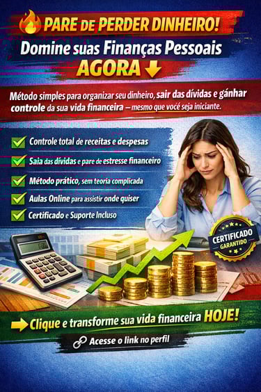 Curso de educação financeira para iniciantes, com foco totalmente prático e aplicação imediata na organização das finanças pessoais. Sem teoria excessiva ou promessas vagas — é método direto, planejamento mensal, controle real de gastos e construção de estabilidade financeira passo a passo.